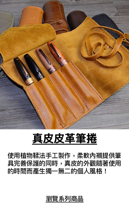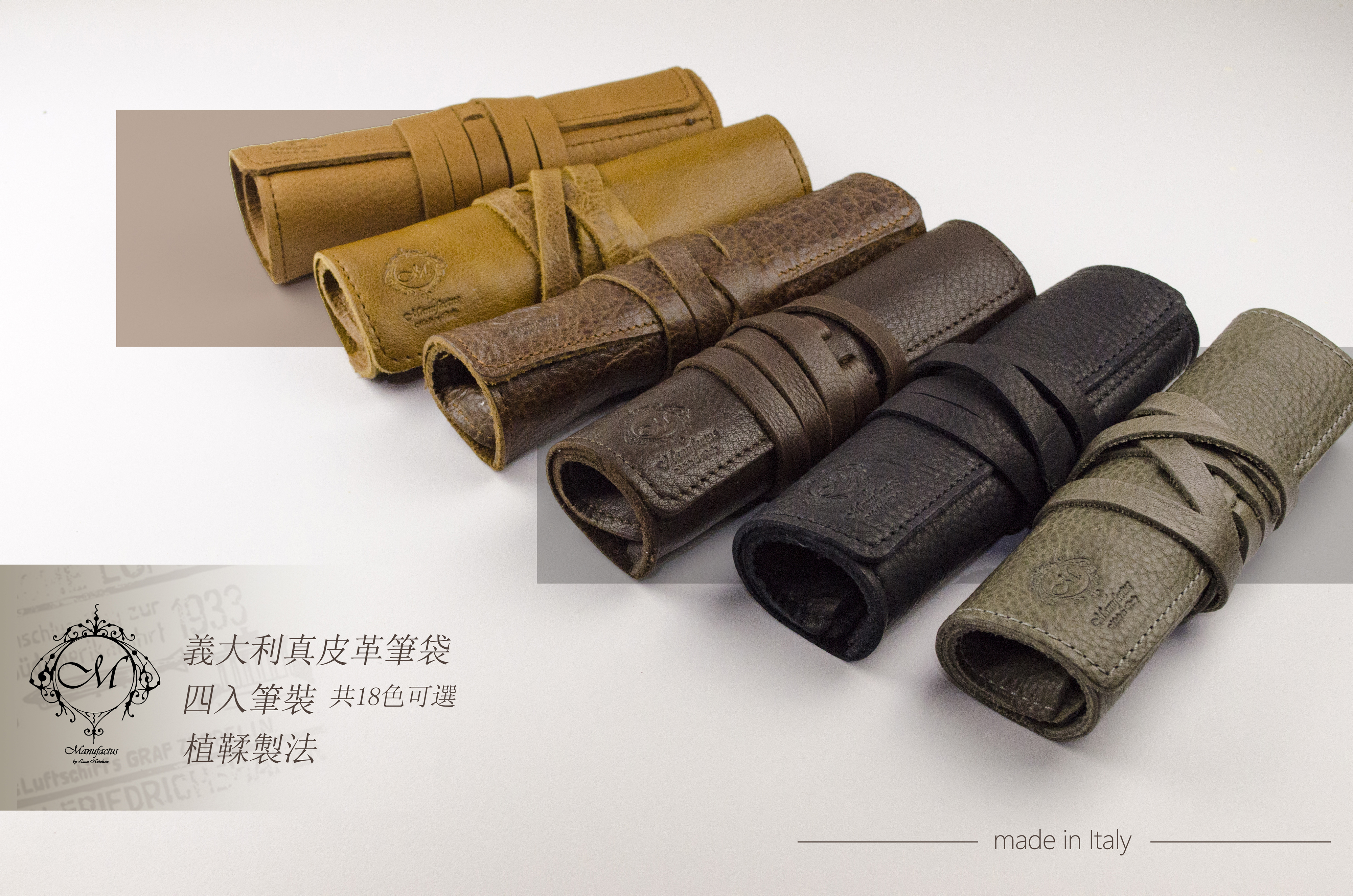 Manufactus 所有皮件採用義大利當地的小牛皮,Full Grain/Vegetable Tanned Leather保有牛皮最原始的狀態,需要經過嚴格的篩選所得,並採用植物鞣法,以從植物萃取出的丹寧酸液來鞣製,不含對人體有危害的物質,是一種可用於可與皮膚直接接觸的綠色環保皮革。