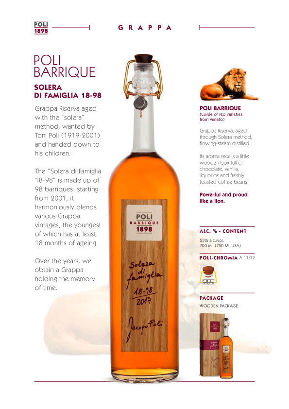 Poli於1898年由 GioBatta 創立,Poli 一詞源自於祖先的名字Polo,GioBatta 原以編製草帽與賣酒維生,但對傳統 Grappa 十分的熱愛的他,在1898年自行打造了一台小型的蒸餾器,於是自此便開啟了百年家族的 Grappa 蒸餾傳承。Poli 家族長年傳承蒸餾技法,自最初代的 GioBattat 傳至 Giovanni、Toni Poli到現在的第四代酒廠負責人 Jacopo Poli,至今已經傳承了一百餘年。