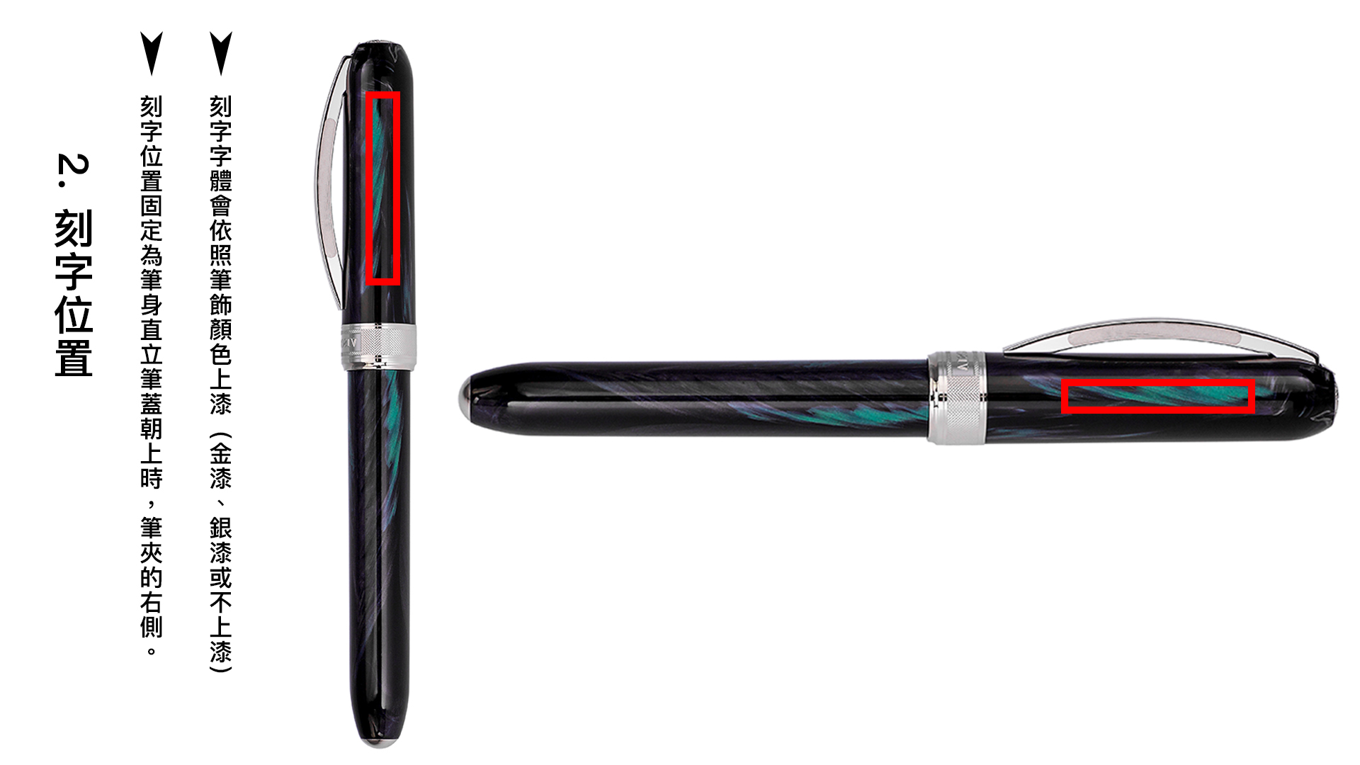 ※ 因材質、特殊筆型設計等等之因素而無法進行客製化刻字之筆款,則不適用於此服務,如有刻字需求,建議先行來訊詢問確認。
