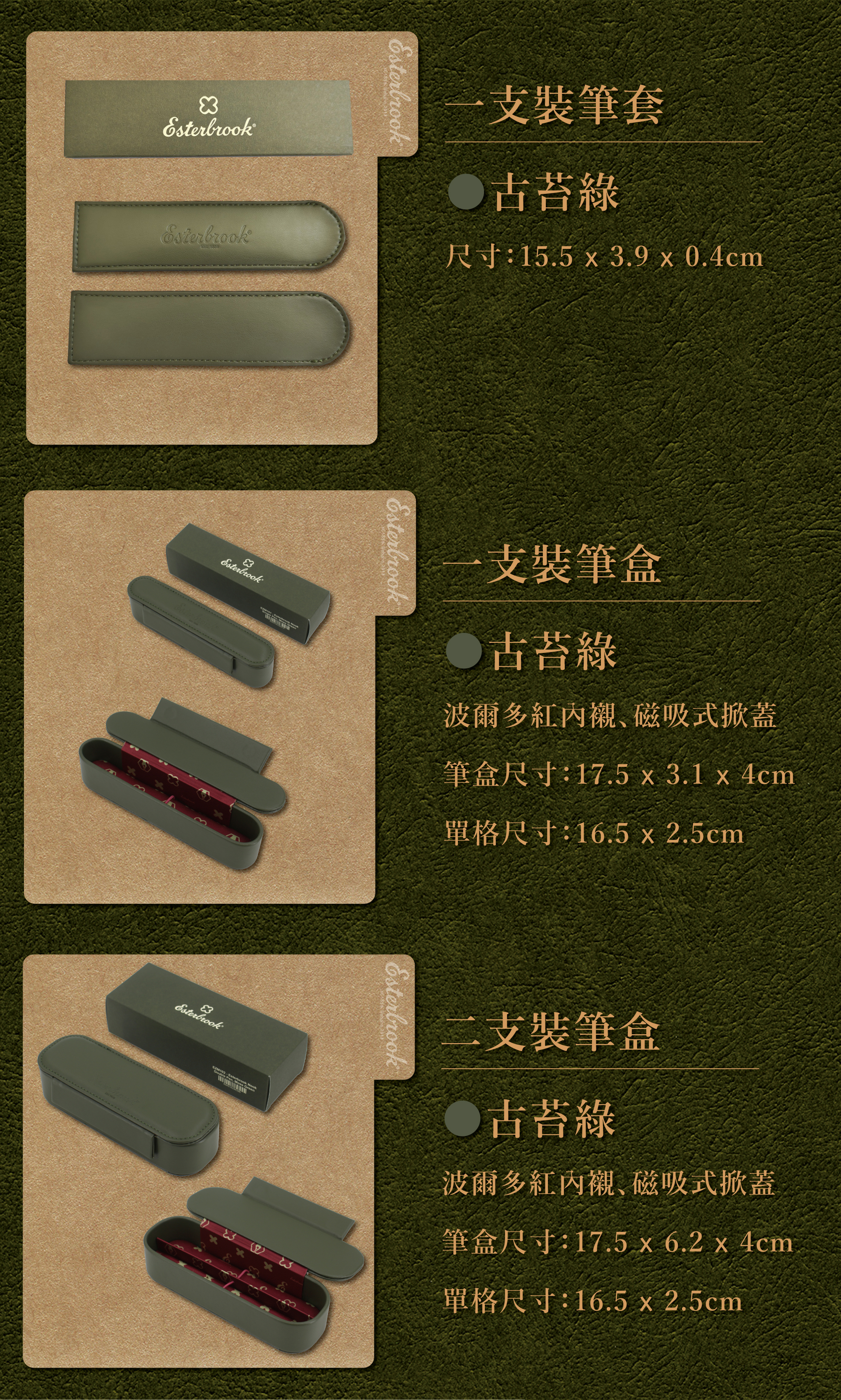 在此介紹 Esterbrook 2025年全新登場的 Nook 系列筆盒!專為精品筆具愛用者、收藏家設計,兼具外觀及功能性的筆具收納系列商品。全新的 Nook 古苔綠採用高品質的人造皮革,並以同色系縫線收邊,表面壓印著經典的 Esterbrook 品牌標誌。內裡採用柔軟的襯墊布料設計,每一個筆位都附有同色系的彈性束帶,確保鋼筆固定穩妥,獨立的空間也避免筆與筆之間相互碰撞,大膽地採用波爾多紅作為內襯的色調,凸顯個人出眾的品味選擇。