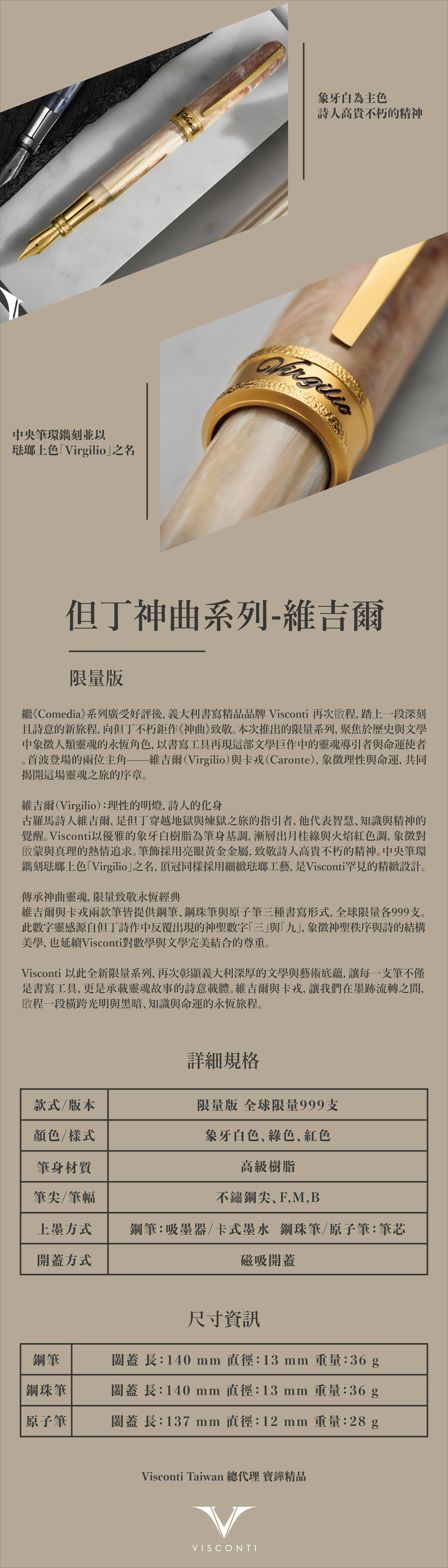 古羅馬詩人維吉爾,是但丁穿越地獄與煉獄之旅的指引者,他代表智慧、知識與精神的象徵。Visconti 以優雅的象牙白樹脂作為筆身基調,並漸層調配出月桂綠與火焰紅色調,象徵對啟蒙與真理的熱情追求。筆飾採用亮眼金色金屬點綴,致敬詩人高貴不朽的精神。中央筆環鐫刻並以琺瑯填色處理展現「Virgilio」之名,頂飾同樣採用細緻琺瑯工藝,獨見 Visconti 的精緻工藝設計。