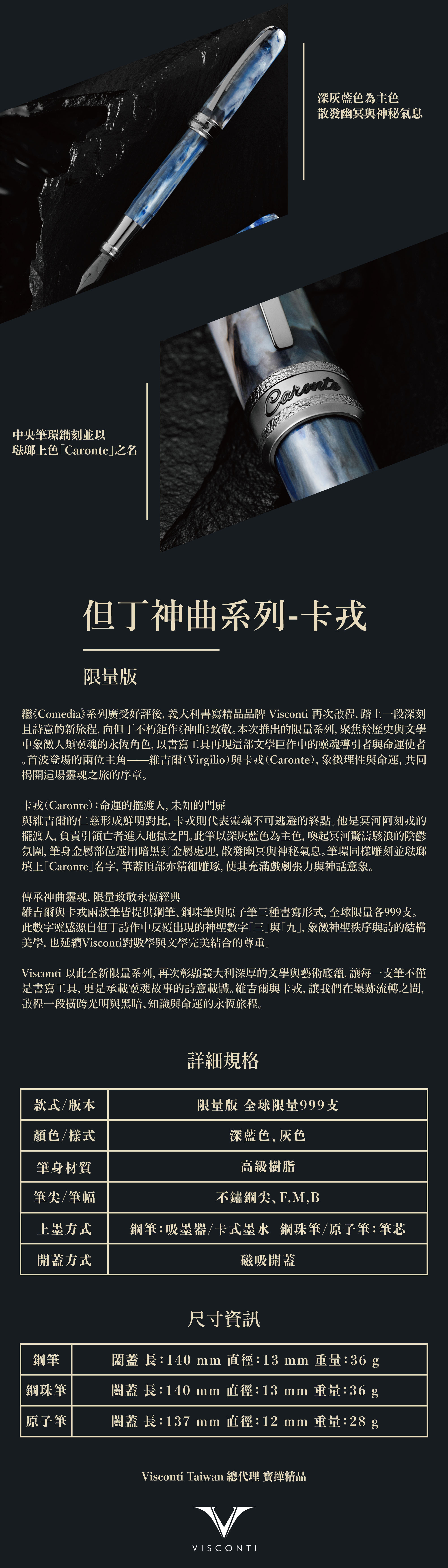 義大利書寫精品品牌 Visconti 再次踏上一段深刻且詩意的新旅程,向但丁不朽鉅作《神曲》致敬。首波登場的兩位主角—維吉爾(Virgilio)與卡戎(Caronte)。