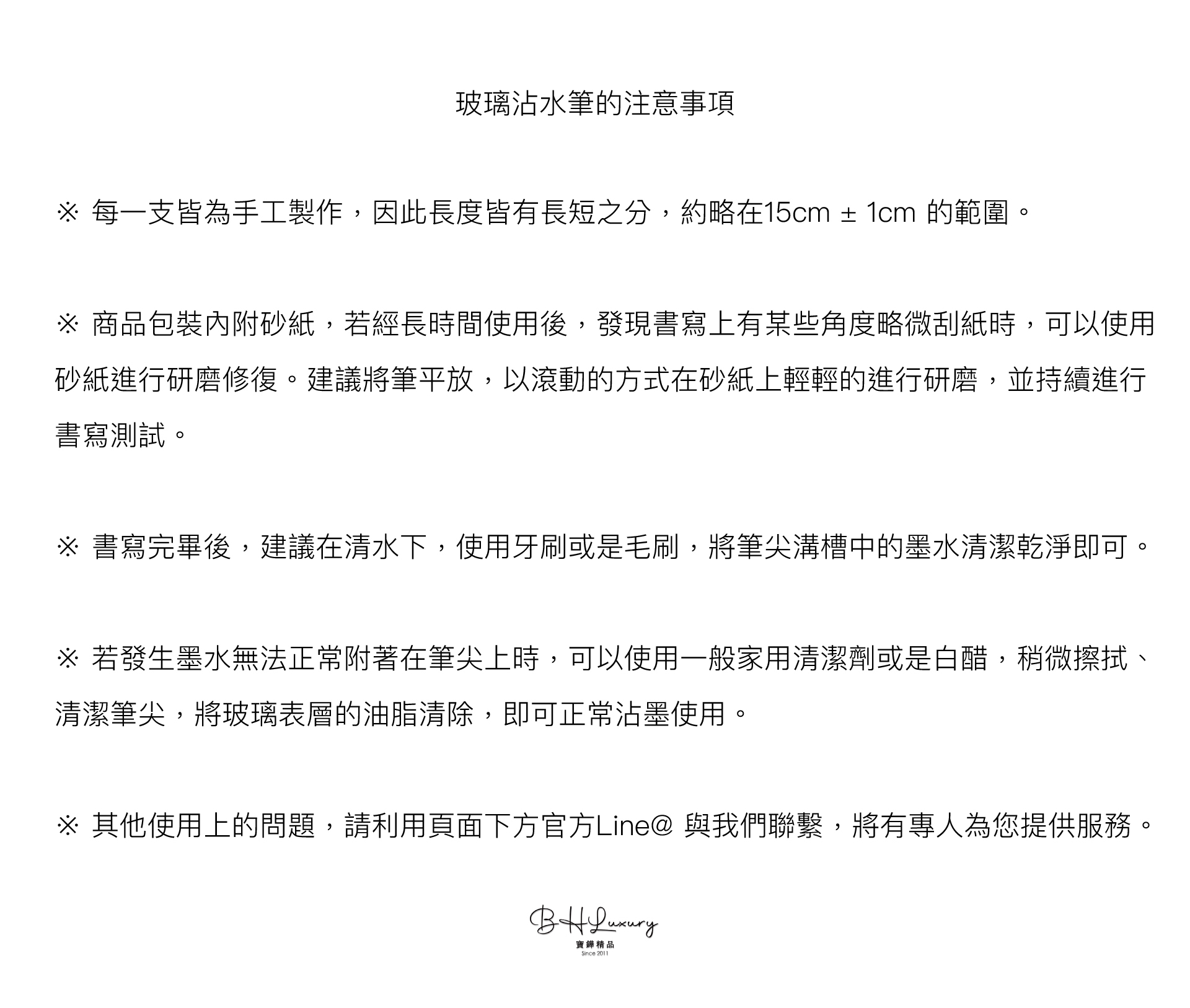 ※提醒您,由於此玻璃沾水筆為手工製,因此每一支的長度皆有長短之分,大約在15cm ± 1cm。
