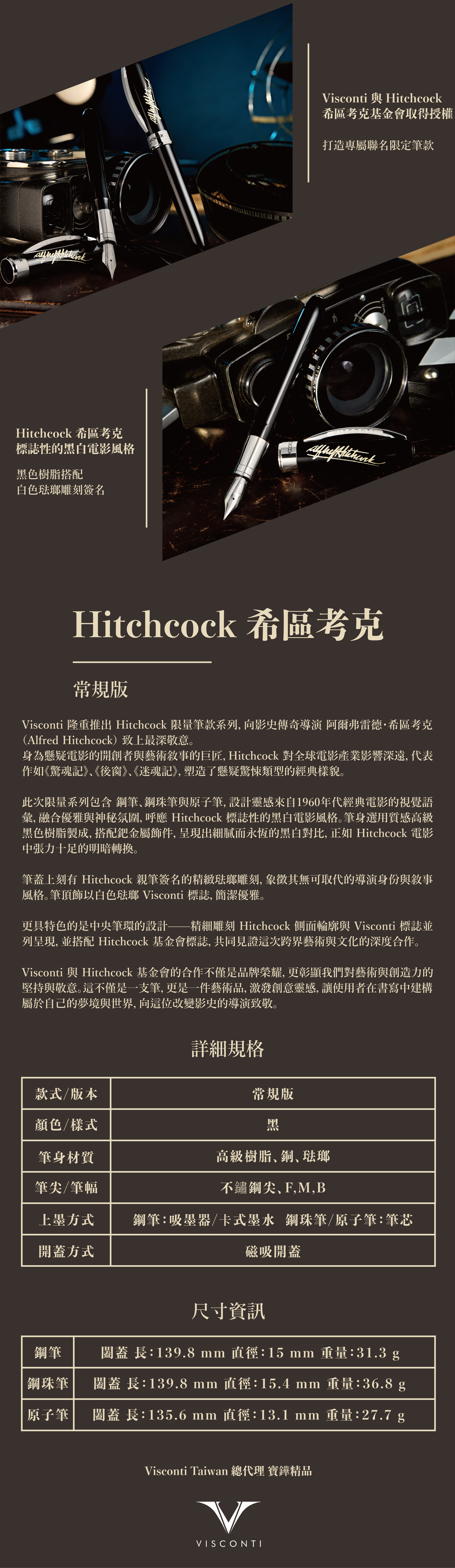 筆蓋刻有 Hitchcock 親筆簽名,筆環精雕其側面剪影與基金會標誌,展現傳奇導演的風範。無論是鋼筆、鋼珠筆或原子筆,這系列皆為創意而生,致敬這位影史最具風格的敘事者。