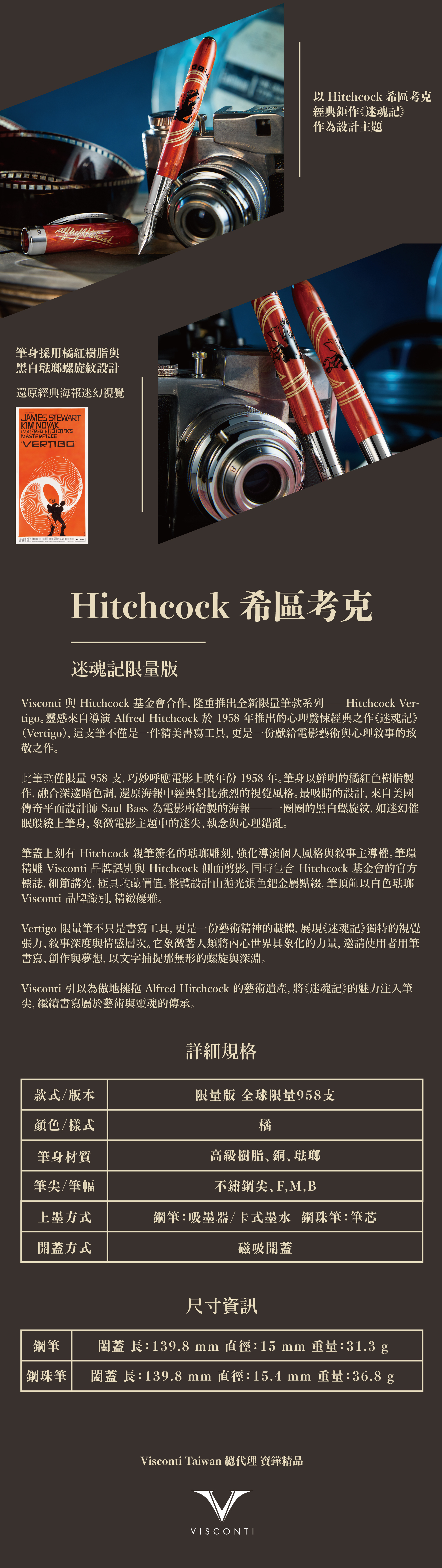 Visconti 以 Hitchcock 經典鉅作《迷魂記》為靈感,推出 Vertigo 限量筆款系列,全球限量 958 支,致敬電影上映年份。